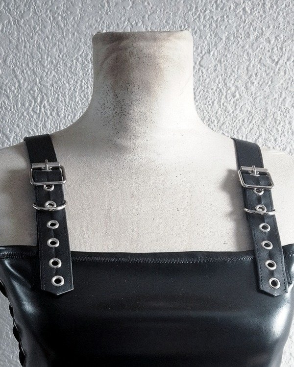 Top de cuerina con breteles regulables. Se puede encargar con cintas de terciopelo o con hebillas.
